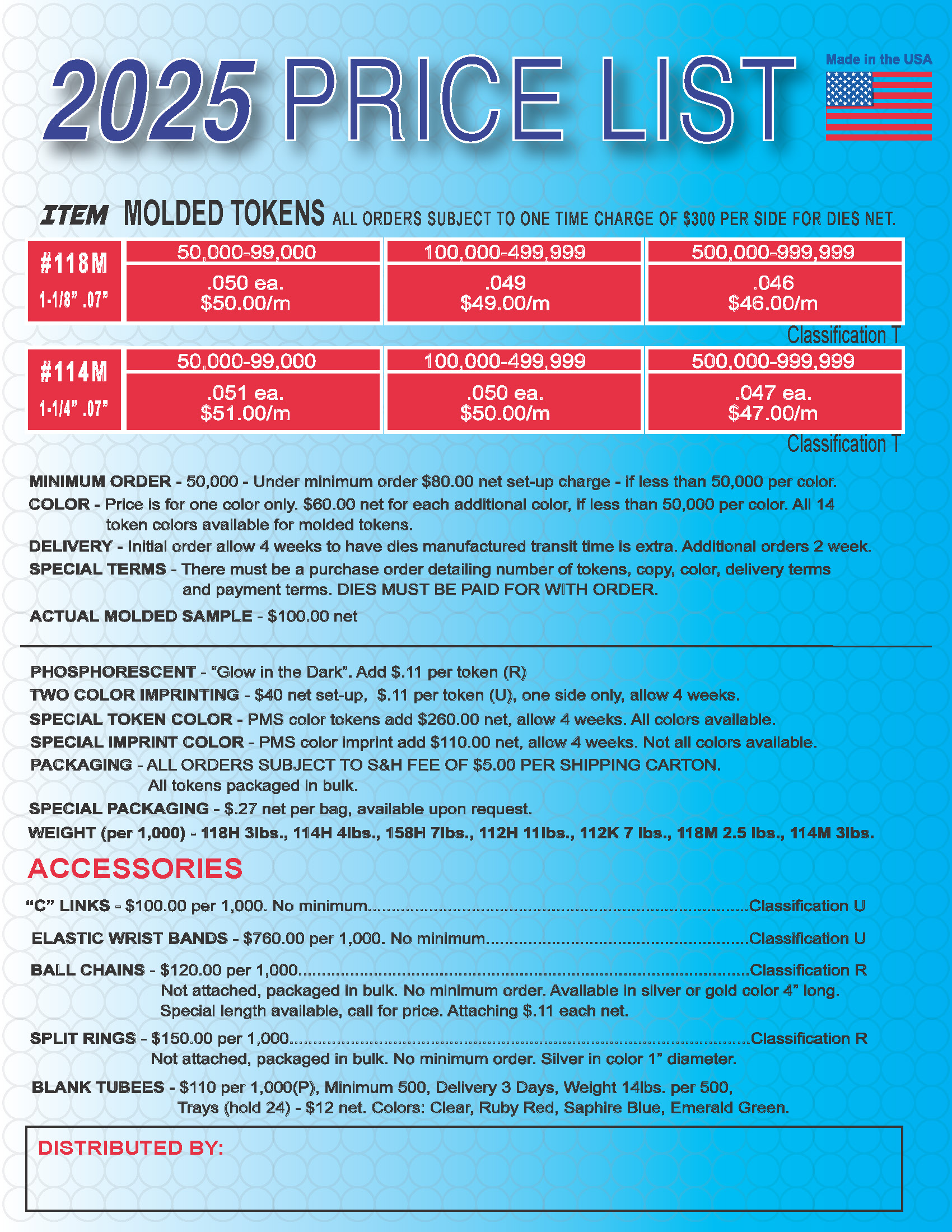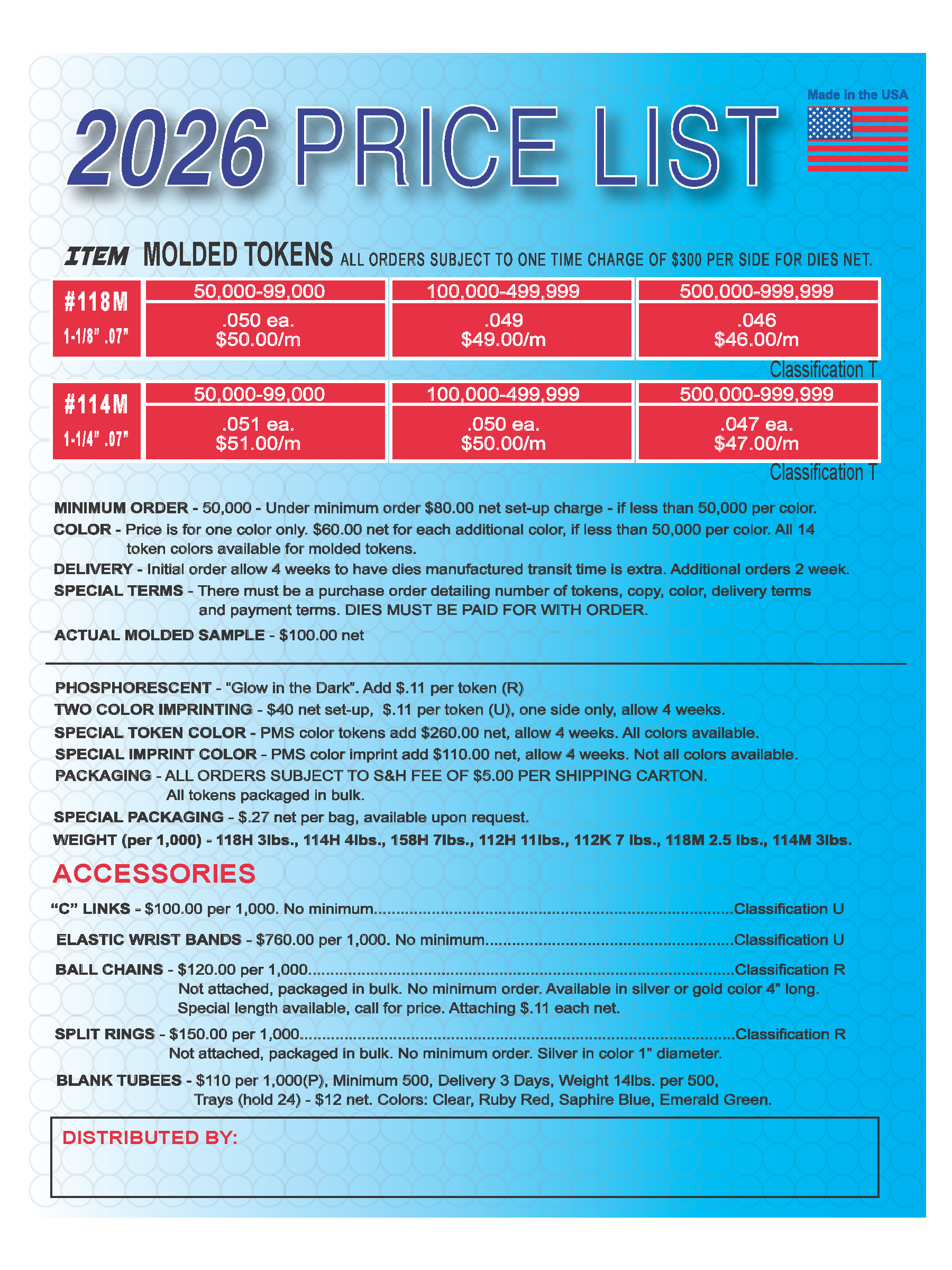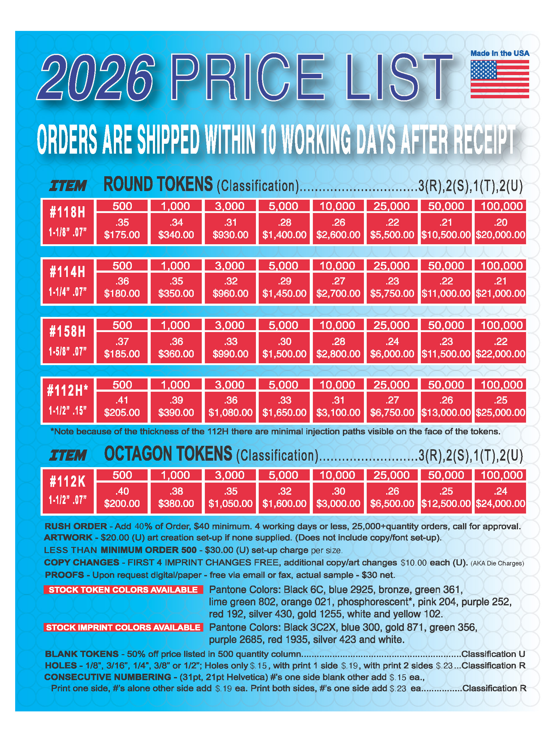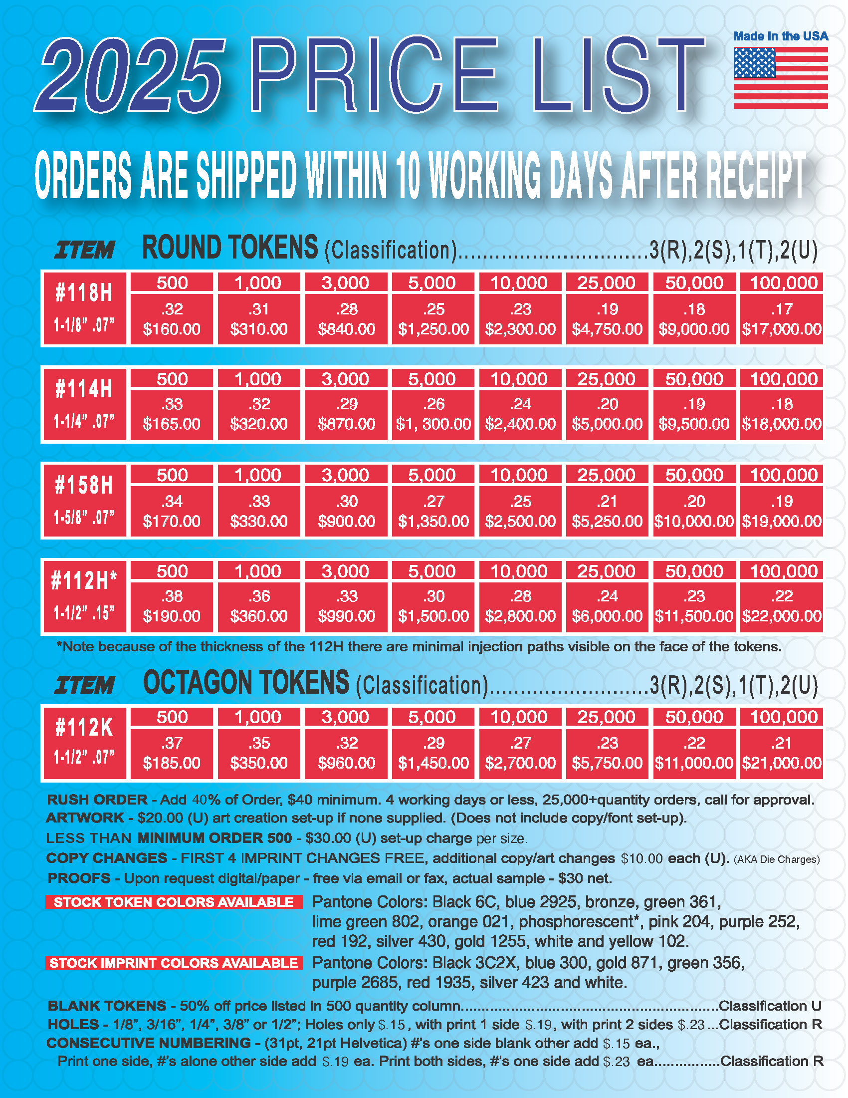 Our tokens are made from a recyclable, non-toxic polystyrene plastic which are then hot stamped or molded with your desired design. All fonts should be within 8-10 point size for legibility. All artwork submitted should be vector and sent over as a pdf, eps, ai or high resolution jpg. The stock pantone colors for the tokens and imprints available are listed on our price sheet. Special token and imprint colors are available upon request and are also listed on our pricesheet. You can mix different token colors and imprint colors within the 500 quantity.